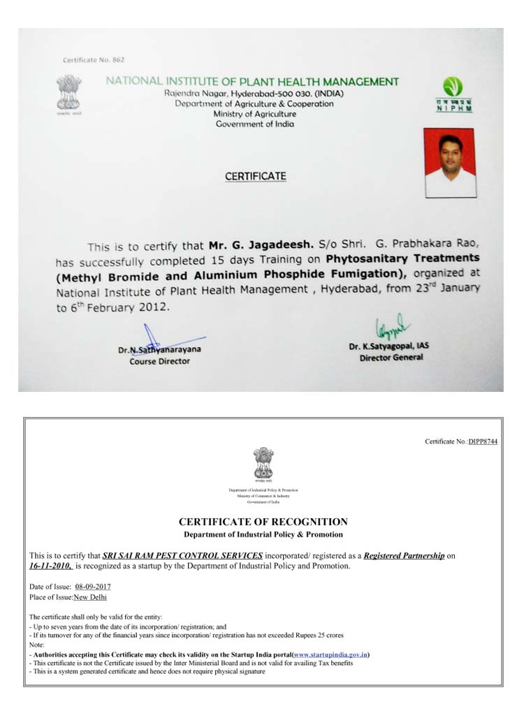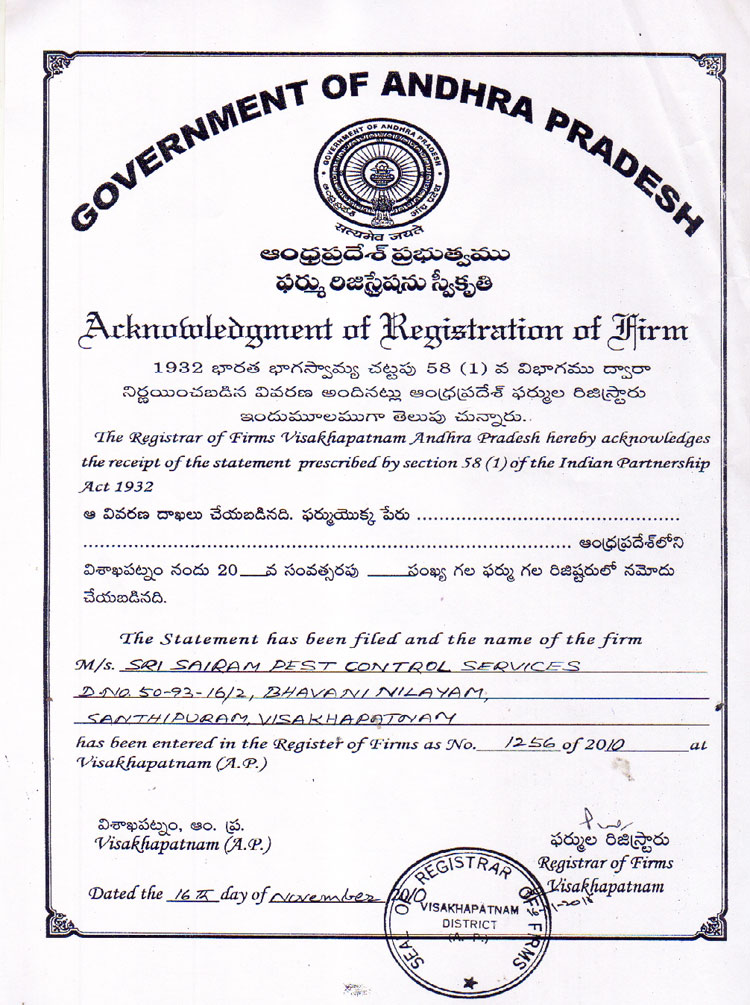 Sai Ram Pest Control Services (SSRPCS) are experts in dealing with Pest Control. We have more than Ten years of experience. SSRPCS is a pioneer in anti termite treatment for Pre Constructions & Post Constructions with its unique methodologies. SSRPCS stands for Integrated Termite elimination methods. We are one of the fastest growing Pest Control Companies. We have a reputation for providing fast, reliable, on-time service for all our valued customers in this market area. Our success can be contributed to our dedicated employees who have been committed to giving our customers the service when they want it. SSRPCS Firm Registered By Government of India, Approval by Government Agriculture Department & Pest Control License by Visakhapatnam Port Trust.